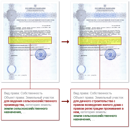 Меняется только вид разрешенного использования с Ведения сельскохозяйственного производства или КФХ на Дачное строительство.